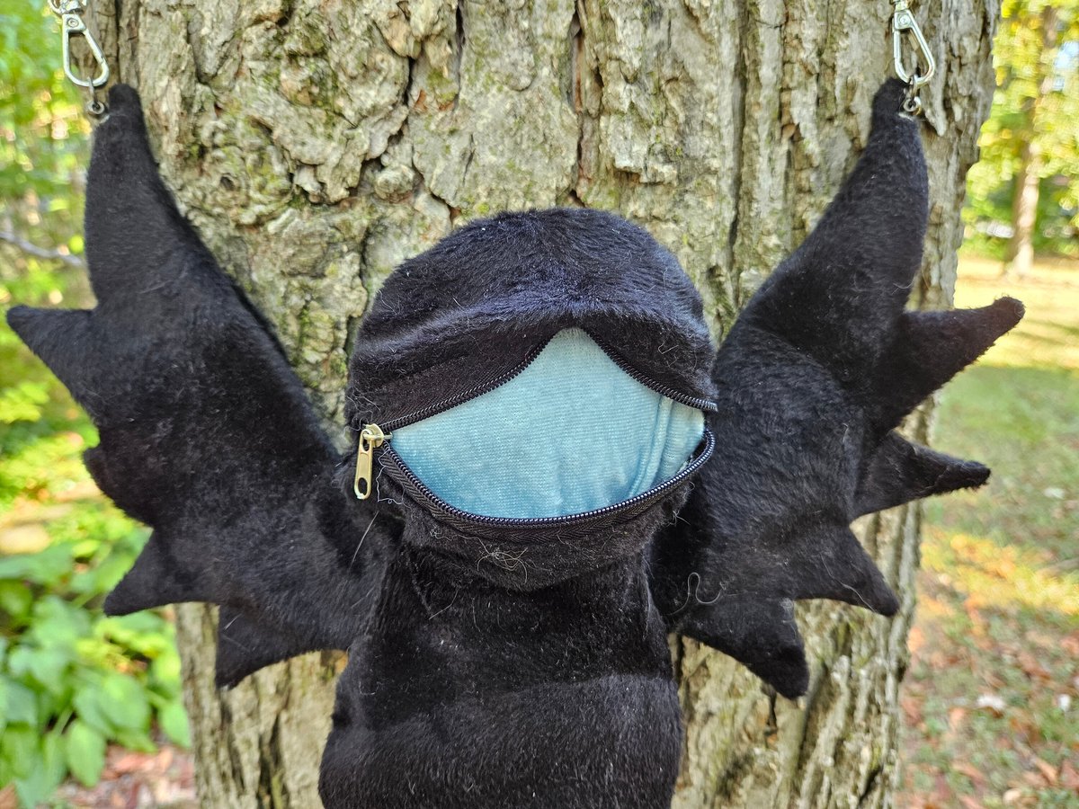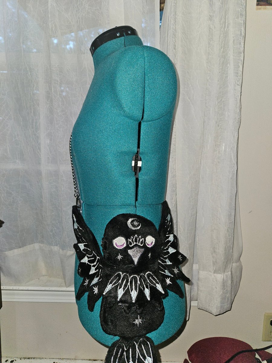 Fashionable and functional, this Midnight Raven makes not only the perfect Familiar for anyone, but can carry cards and cash while keeping you company! Velvety soft and gorgeous, the wing span measures ~15" and is 12" from top of head to tip of the tail.
